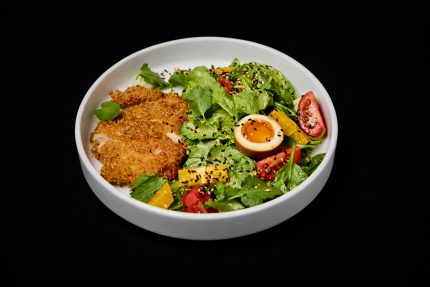 18,50 BYNСалат микс, куриный шницель, апельсин, ореховая заправка, черри, маринованное яйцо, кинза, кунжут ким-чи.