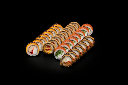 56,90 BYNЗапеченный рол с креветкой, Запеченный ролл с лососем, Запеченный ролл с угрем, Запеченный ролл с крабом.