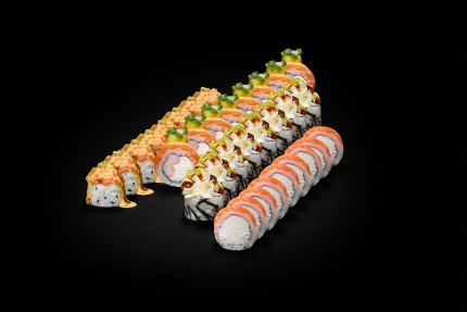 73,90 BYNСяке темпура, Запеченный ролл с лососем, Жареный бекон с криспи луком, Филадельфия классик 4шт, Кайсо эби 4шт, Нагасаки мак.