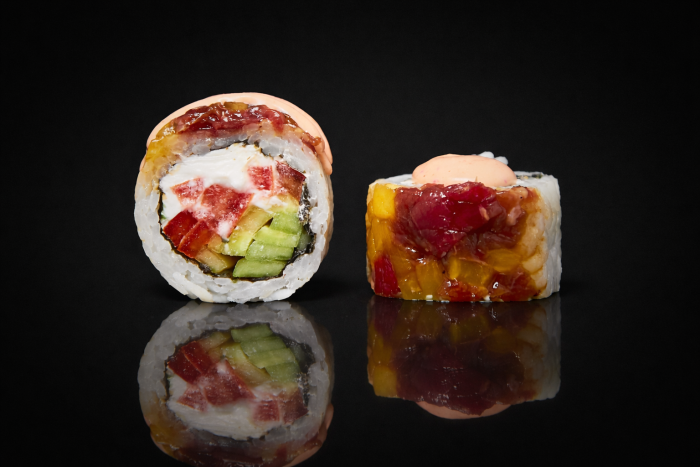Рис, нори, сыр сливочный, огурец, томат, говядина, соус устричный терияки, редис маринованный, спайси соус.