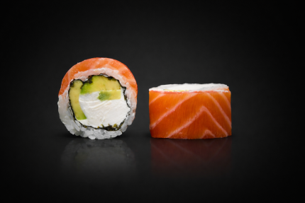 Рис, нори, сыр сливочный, лосось, огурец, стружка тунца.