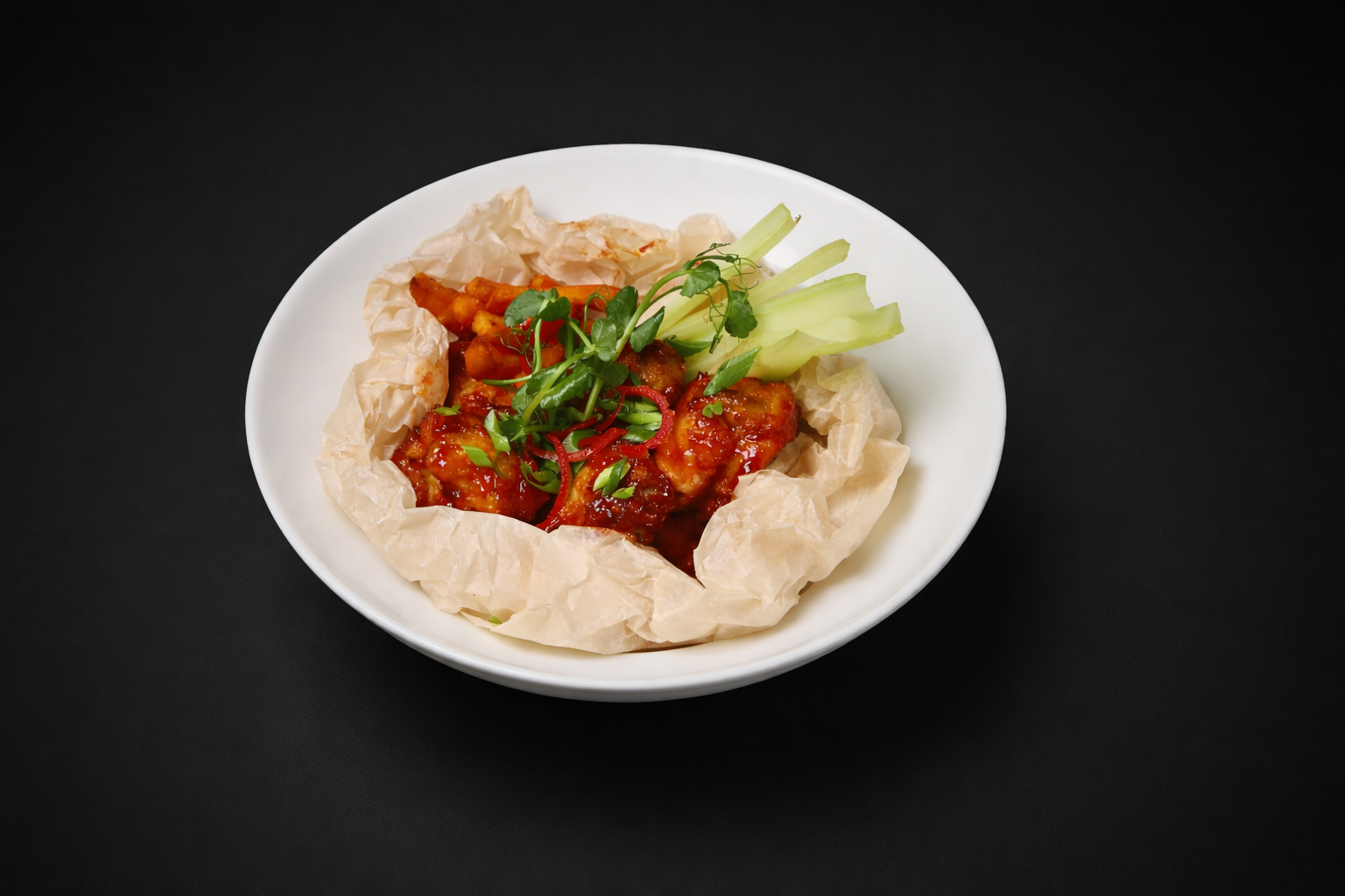 Крыло куриное в глазировке, соус кисло-сладкий, батат фри, сельдерей, зелёный лук, кинза, чили.