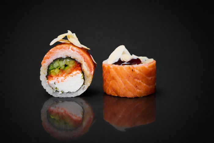 Рис, нори, сыр сливочный, икра тобико, огурец, лосось опаленный, соус унаги, лепестки миндаля