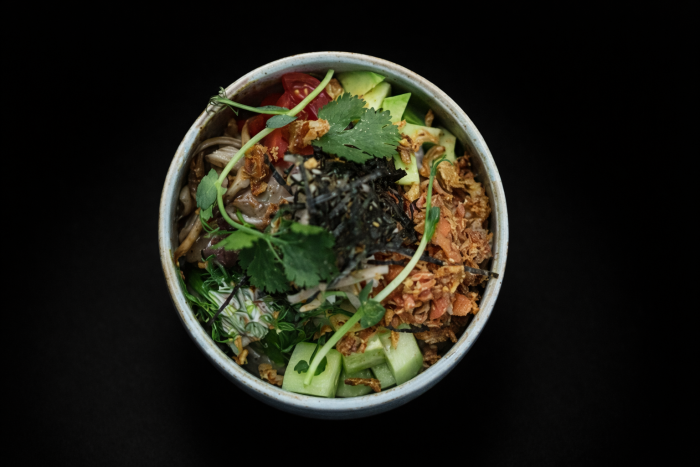 Рис, лосось терияки, огурец, вешенки, авокадо, овощи микс, черри, водоросли хияши, кунжутно-ореховый соус, кранч лук, нори, спайси соус.