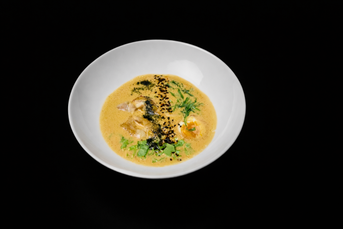 Бульон рамен, лапша удон, тахини, салат романо, куриное бедро, лук зеленый, маринованное яйцо, микс водорослей, кунжут ким-чи.