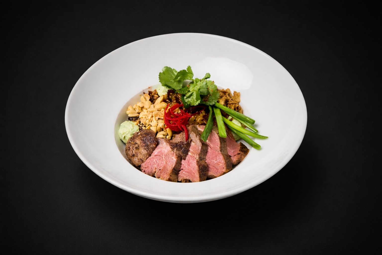 Рис, говядина су-вид, древесный гриб, вешенки, лук, скрембл из яйца, крем сливочный с кинзой, соус азиатский BBQ, чили, лук зеленый, кинза, кранч лук.