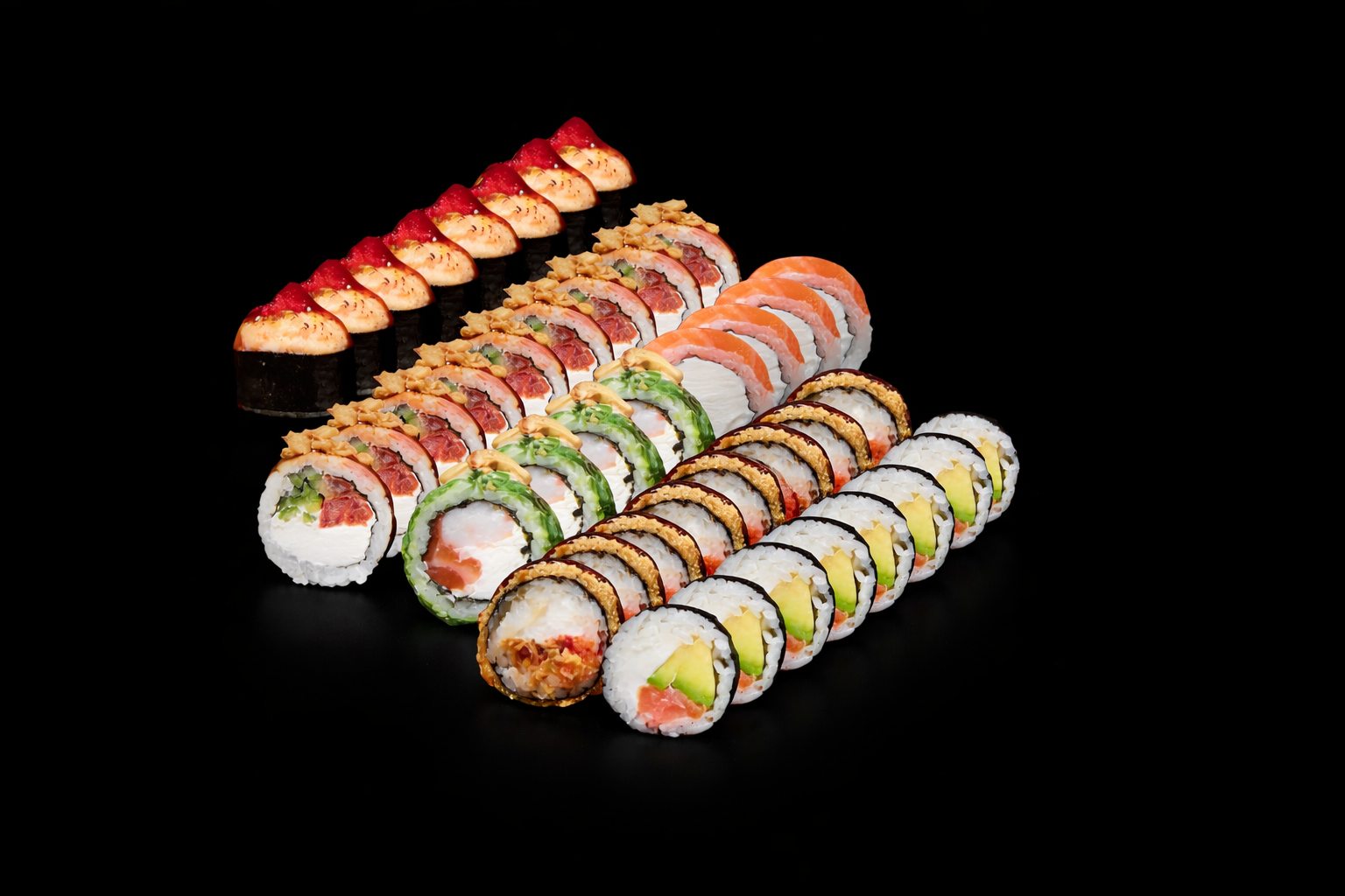 Сяке темпура, Запеченный ролл с лососем, Жареный бекон с криспи луком, Филадельфия классик 4шт, Кайсо эби 4шт, Нагасаки мак.