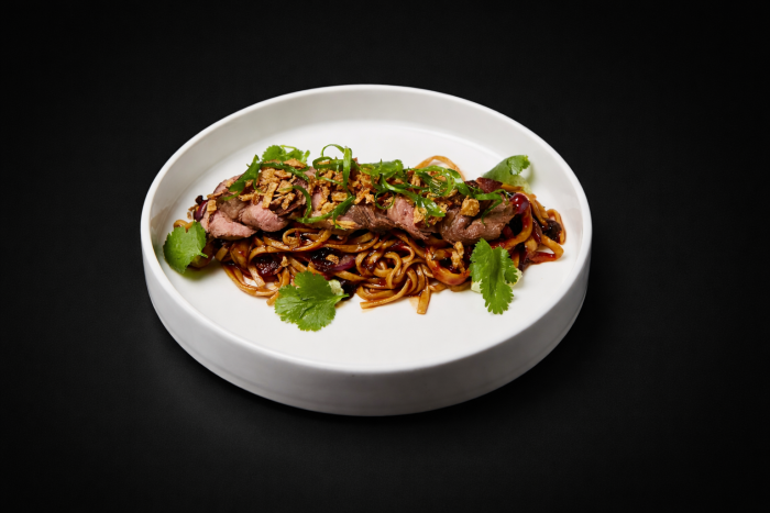 Лапша удон, говядина су-вид, гриб древесный, вешенки, лук, крем сливочный с кинзой, соус азиатский BBQ, кинза, лук зеленый, кранч лук, чили.