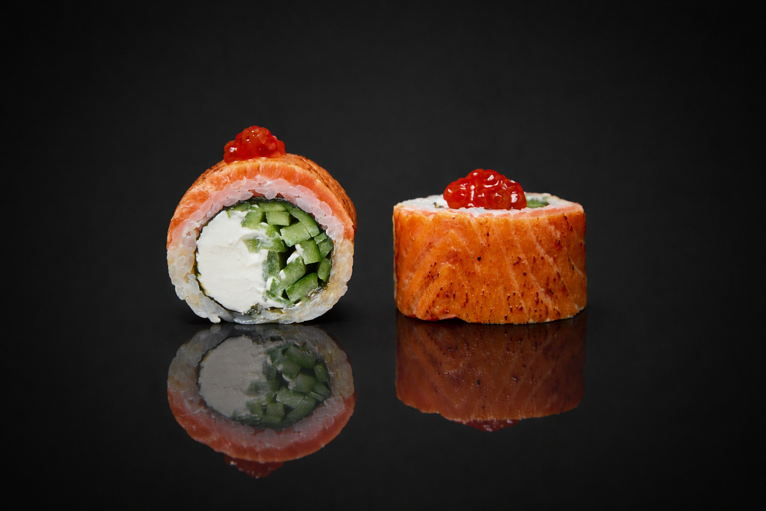 Рис, нори, сыр сливочный, огурец, лосось опаленный, икра лососевая.